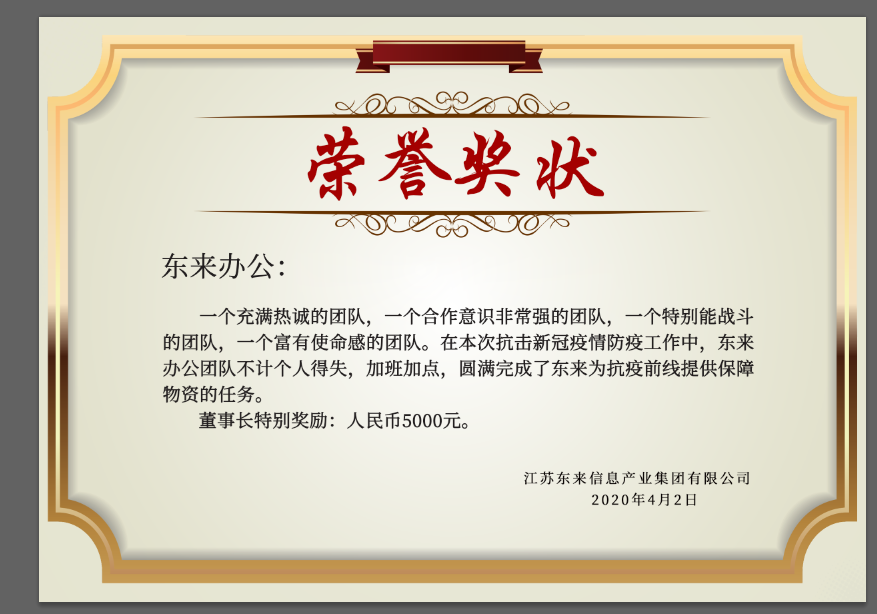 在抗擊新型冠狀病毒感染的肺炎疫情的戰(zhàn)斗中,東來辦公的全體同仁,假日無休,冒著風(fēng)險(xiǎn),完成各合作醫(yī)院的防疫物資供應(yīng),為此,集團(tuán)決定即時(shí)表彰東來辦公全體員工特別嘉獎(jiǎng),并獎(jiǎng)勵(lì)現(xiàn)金5000元。